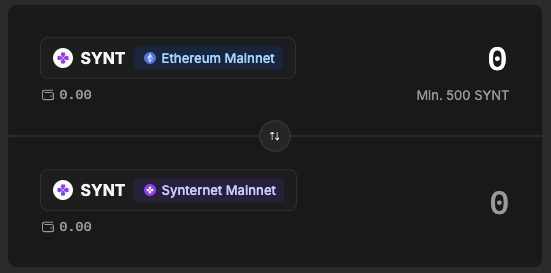 - Choose the source and destination blockchain with a switch button: in this case Ethereum has to be on top, Synternet - on the bottom: