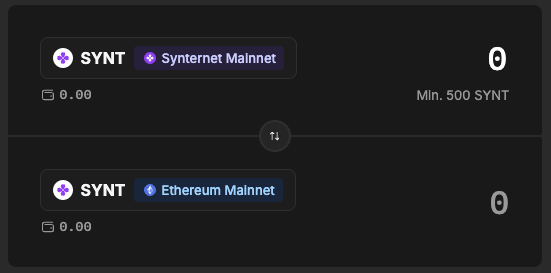 Minimum amount of tokens that can be sent via bridge is 500 SYNT. The floor is imposed to prevent spam and protect users for paying more in gas costs than the value of tokens they are bridging.