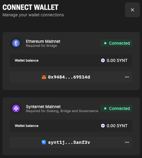 If you click the wallet on the top right and select Manage Connections, both your wallets should show up as green:
